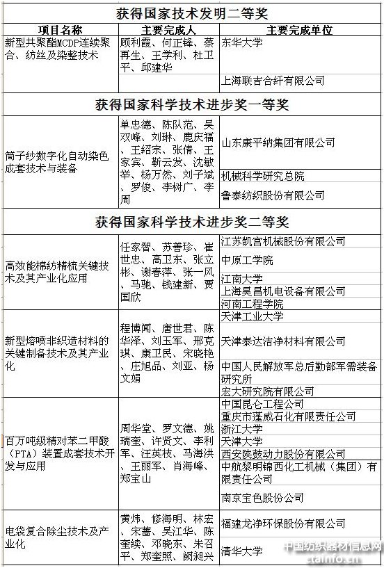 6个获奖项目中,有两项是纺织机械装备类项目,除一等奖“筒子纱数字化自动染色成套技术与装备”外,由江苏凯宫机械股份有限公司、中原工学院、江南大学、上海昊昌机电设备有限公司、河南工程学院联合完成的“高效能棉纺精梳关键技术及其产业化应用”项目获得国家科学技术进步二等奖。