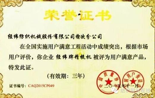 全行业唯一 经纬牌精梳机获“全国用户满意产品”殊荣