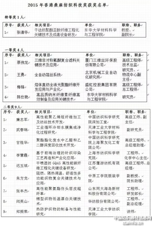 2015年香港桑麻纺织科技奖的评审是在21份有效推荐材料的基础上,按照《2015年香港桑麻纺织科技奖评选条例》,经纺织、纺机、化纤、染整、高新等5个预审小组的预评审,又经香港桑麻基金会受托人、中国工程院纺织行业有关院士等组成的终评会的评审,本着公开、公正的原则,经无记名投票,最终评选出2015年香港桑麻纺织科技奖14名,其中特等奖1名,一等奖4名、二等奖9名。