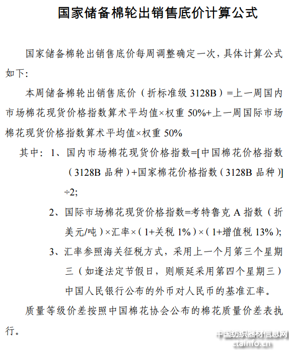 (四)轮出价格。储备棉轮出销售底价随行就市动态确定,原则上挂牌销售底价与国内外棉花现货价格挂钩联动,由国内市场棉花现货价格指数和国际市场棉花现货价格指数各按50%的权重计算确定,每周调整一次(具体计算公式见附件)。
