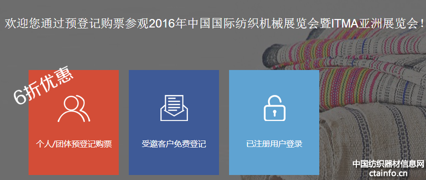 2016年中国国际纺织机械展览会暨ITMA亚洲展览会”,将于 2016年10月21 日~ 25日在国家会展中心(上海)再度起航。与世界各大顶级专业展会一样,观众参观需购票入场。“中国国际纺织机械展览会暨ITMA亚洲展览会”(以下简称“纺机展”)始终秉承为行业提供专业服务的原则,谢绝非专业人士入场,努力为展商和客户提供一个高效的交流平台,得到了展商和业内人士的积极支持和欢迎。2016年中国国际纺机展暨ITMA亚洲展将会继续采取购票入场的措施。为了方便观众到场参观,日前,纺机展观众预登记系统正式上线使用。10月18日前,观众都可登录展会官网进行在线注册。