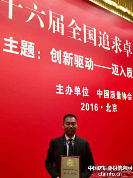 2016年11月10日,由中国质量协会主办的主题为“创新驱动——迈入质量时代”的第十六届全国追求卓越大会在北京人民大会堂隆重举行。金轮针布(江苏)有限公司作为今年纺织行业内唯一的获奖者,获颁了“全国实施卓越绩效模式先进企业”,金轮针布董事长、总经理黄春辉代表公司出席了颁奖仪式。