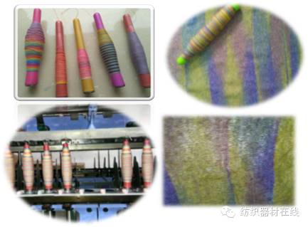 b) 以三种不同颜色的粗纱喂入,经耦合牵伸、混合加捻,纺制细纱可适于机织、针织工艺。可纺制段彩纱、竹节彩色纱、段彩竹节纱等等;
