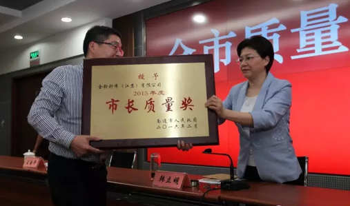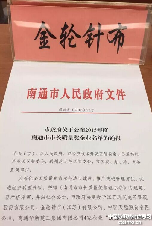 2016年6月2日下午,在江苏省质量工作会议和南通市质量工作会议上,金轮针布(江苏)有限公司常务副总经理龚伟从南通市委副书记、市长韩立明手上接过了“2015年南通市市长质量奖”的奖牌。