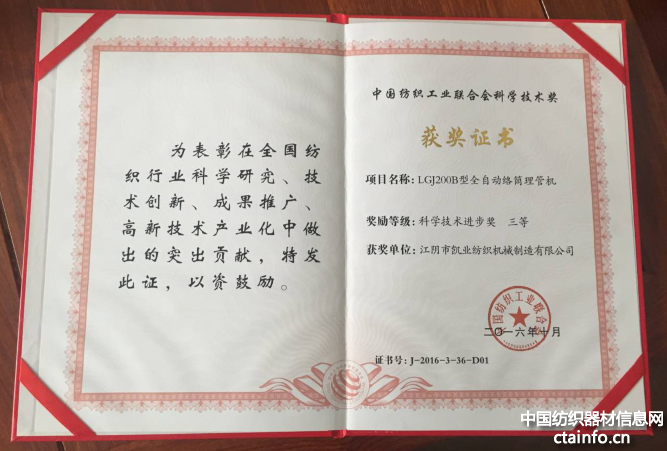 2016年11月23日,在“纺织之光”2016年度中国纺织工业联合会科技教育奖励大会上,江阴市凯业纺织机械制造有限公司凭借其最新产品“LGJ200B型全自动络筒理管机”获得2016年度中国纺织工业联合会科学技术进步奖三等奖的殊荣。这是全行业对凯业纺机在全国纺织行业科学研究、技术创新、成果推广、高新技术产业化中做出突出贡献的肯定。