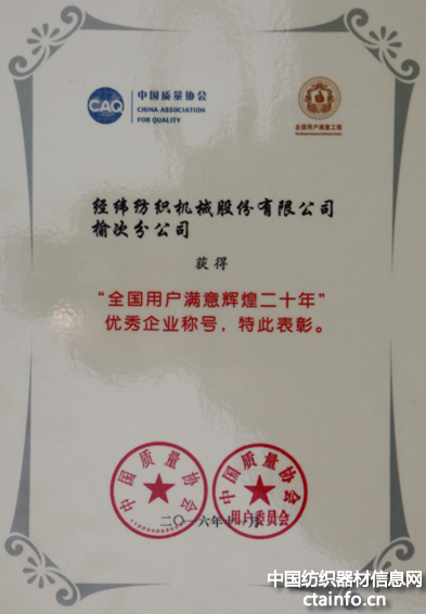 2016年11月23日~25日,在中国质量协会组织召开的“2016年全国实施用户满意工程推进大会”上,经纬纺织机械股份有限公司榆次分公司获得“全国用户满意辉煌二十年”优秀企业殊荣,为纺机行业唯一获奖企业。获得此荣誉的还有厦门航空、上海日立电器、珠江钢琴、江铃汽车等28家国内各行业知名品牌企业。