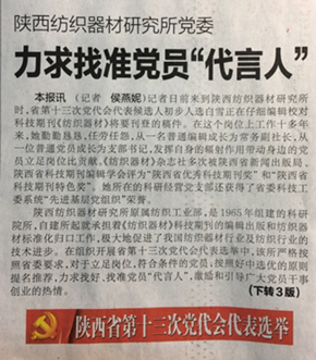 在组织省第十三次党代会代表选举中,陕西纺织器材研究所党委严格按照省委要求,立足岗位,力求找准党员“代言人”,将素质强、修养好、工作实绩突出,符合科研院所发展的,具有参政议政能力的科研生产一线的优秀年轻党员选出来。并提出了“讲党性,心有党;遵法纪,行有规;严律己,心有戒;强素质,重修养;勇担当,有作为;立岗位,择优选”的三十六字方针。通过所属4个党支部的提名推荐,所党委充分酝酿,逐级遴选,推荐白雪同志作为省委科技工委出席省第十三次党代会代表候选人初步人选。