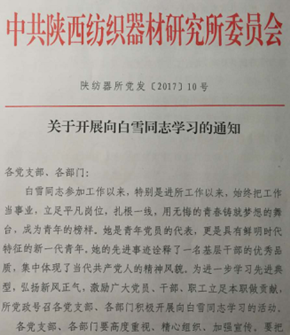 2017年4月1日,为进一步学习先进典型,弘扬新风正气,激励广大党员、干部、职工立足本职做贡献,陕西纺织器材研究所党政号召各党支部、各部门积极开展向白雪同志学习的活动。