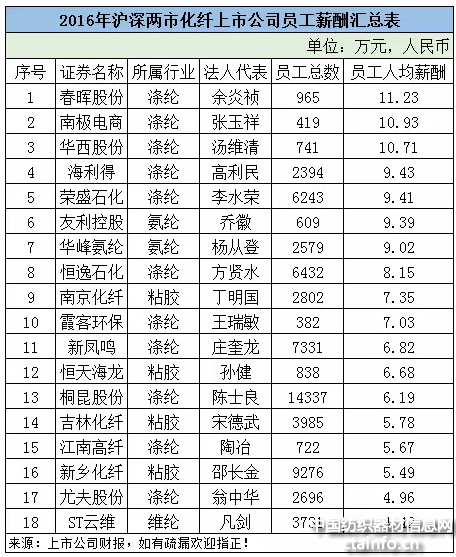 纺织化纤板块中,春晖股份、南极电商和华西股份居前三甲,所属行业均为涤纶。其中春晖股份以员工人均薪酬11.23万元人民币居首位!此外,海利得、荣盛石化、华峰氨纶等企业也在榜单前列!