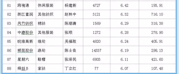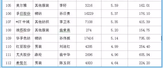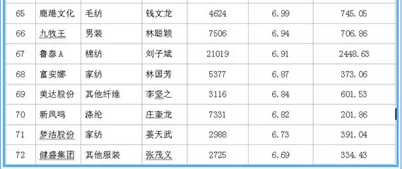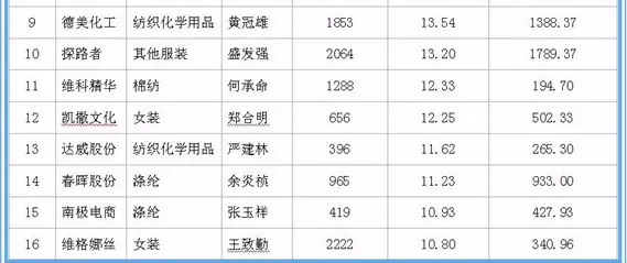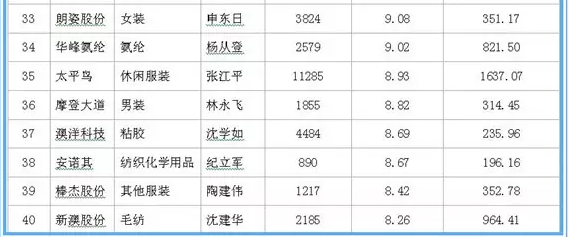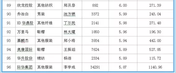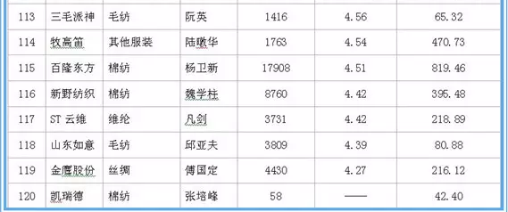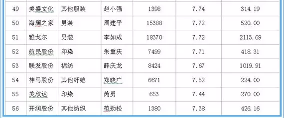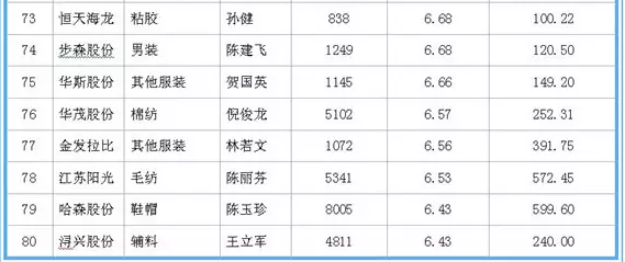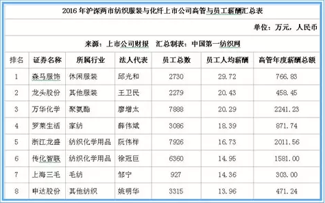 据中国网络监测数据显示,在沪深两市120家纺织服装上市公司中,在职职工人均薪酬方面:森马服饰领衔第一,2016年在职职工数量达2730人,人均薪酬达29.72万元;龙头股份紧随其二,2016年在职职工数量达2279人,人均薪酬20.43万元;万华化学为第三名,在职职工数量达7888人,人均薪酬20.29万元。