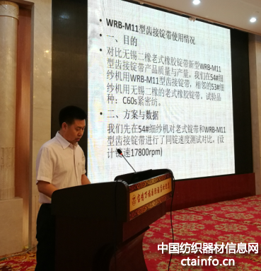 陕西金润德实业有限公司技术总监陈百合先生做了《WRB-M11齿形锭带使用情况》的报告。他说,老式锭带正面绿色,内面黄色,黄色面接触滚盘、张力盘、锭盘。新型M11锭带涂胶面(黑色)接触滚盘和张力盘,绿色面接触锭盘,站在细纱机前看到的是黑色面。该锭带主传动用涂胶面,增大摩擦力,利于刹住锭子,拔管接头,传动效率高,上车以来没有发生断带问题。