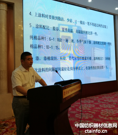 咸纺集团技术主任刘俊杰先生为大家做了《WRC-868铝衬管胶辊在生产上的应用》的报告。他分析了该胶辊的特性,制作注意事项和使用效果。通过生产实践表明,WRC-868型免处理胶辊有弹性高,硬度适中,压缩变形小,吸放湿性优等特点,无走熟期,降低劳动强度,改善成纱质量,减少断头,提高生产效率。刘主任强调说,对胶辊加油要采取“少加勤加”的方法,周期一般掌握在5~6个月,以大多数胶辊上车后油脂不外溢、不污染纱为标准,这是一定要注意的。