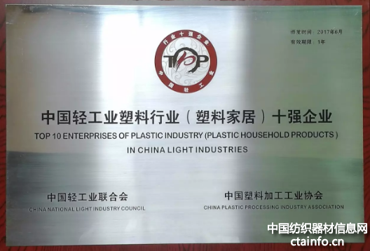 中国轻工业塑料行业十强企业评价工作是以企业自愿申报为基础,由各行业协会对企业数据审核并推荐,由中国轻工业联合会对参评企业2016年度主营业务收入、利润总额、主营业务收入利税率及主营业务收入增速四项指标进行统一评价打分。评价结果需经各行业协会复核并经中国轻工业联合会会长办公会审定批准,是企业综合实力的反映。“中国轻工业塑料行业(塑料家居)十强企业”是一项极具含金量的荣誉。