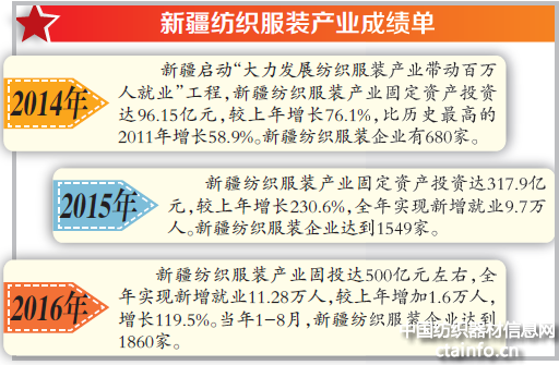 2016年,新疆纺织服装产业固投达500亿元左右,全年实现新增就业11.28万人,较上年增加1.6万人,增长119.5%。