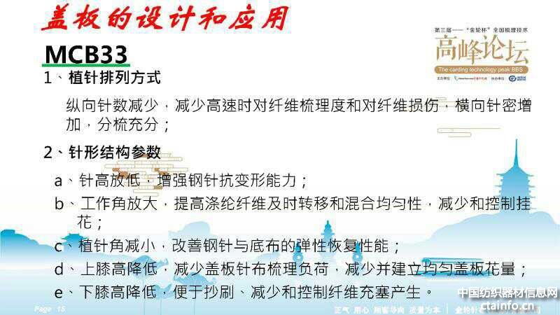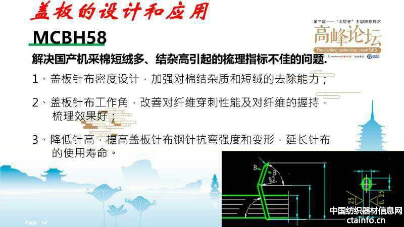 目前,在纺织界,公认的梳理分区有3个,即:刺辊和给棉罗拉之间;锡林和盖板之间;锡林和前后固定盖板。存在争议的分梳区域也有3个,即:刺辊和锡林之间;刺辊和预分梳板之间;锡林和道夫之间。根据盖板针布的5大设计要求(释放能力、穿透性能、握持能力、浮游纤维量控制、梳理力的稳定性),和3个对应条件(原料性能、锡林针布参数、梳理工艺相适应),金轮针布(江苏)有限公司建立数据模型,据此来设计针布参数,推出的MCBH58高密度盖板针布和MCB33型盖板针布。