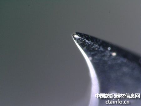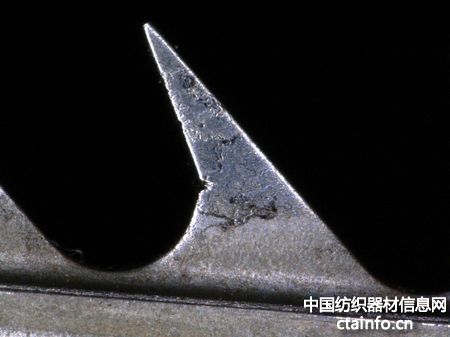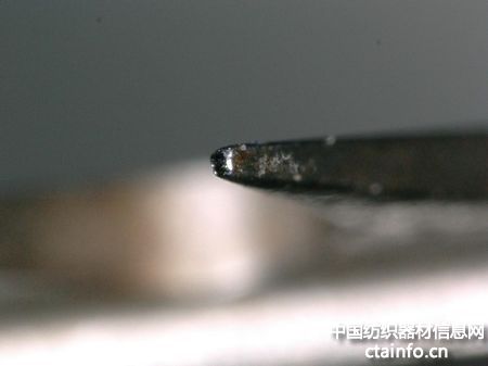 2014年4月,公司将“境泉”OK40型弧齿分梳辊针布配套欧瑞康BD380型气流纺机,至2017年4月,通过基恩士显微检测仪检测,其齿顶及齿体出现轻微磨损。而国外某品牌OK40型直齿分梳辊针布使用1.5年,其磨损远超过“境泉”使用3年的同型号产品,具体对比见图3和图4。