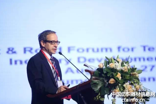 国际纺织制造商联合会总干事克里斯蒂安·辛德勒(Dr. Christian P. Schindler)作了主题为“困境中的纺织(机械)产业”的演讲,讲解了全球纺织服装行业制造业现状与展望,防止制造行业中的新型颠覆性技术与创新,目前制造业的投资领域,以及对全球纺织行业的影响。