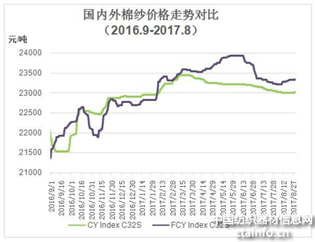 月底,标准级皮棉价格约15916元/t,较7月底上涨28元/t,涨幅约0.18%。国产18.22 tex纯棉纱月均价为23016元/t,较7月减少90元,减幅约0.39%;进口纱现货18.22 tex纯棉纱月均价为23288元/t,较上月下跌31元,跌幅0.13%。月底,进口纱现货价格高于国产纱331元/t,两者价差较7月底扩大149元/t。