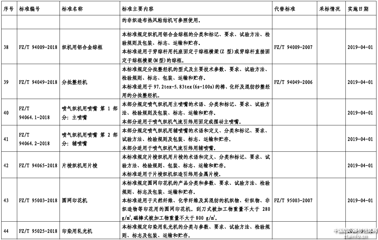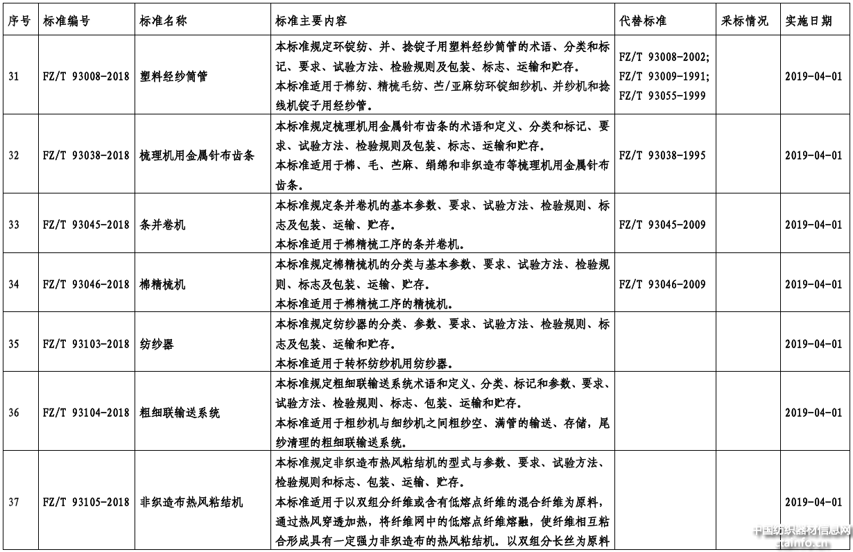 48项纺织行业标准中,有6项标准是由全国纺织机械与附件标准化技术委员会纺织器材分技术委员会(SAC/TC 215/SC2)归口的,分别是:塑料经纱筒管,梳理机用金属针布齿条,织机用铝合金综框,喷气织机用喷嘴 第1部分:主喷嘴,喷气织机用喷嘴 第2部分:辅喷嘴,片梭织机用片梭。