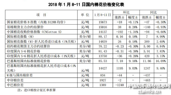 随着春节临近,国内部分纺企开始少量备货,棉花询价、采购积极性缓慢提升,国内棉价整体呈现弱势,局部地区略有回暖迹象,郑棉期价随外盘上涨。1月8-11日代表内地标准级皮棉销售均价的国家棉花价格B指数15662元/吨,较上周下跌12元/吨,跌幅0.07%。郑州棉花期货CF1801合约结算价15211元/吨,较上周上涨190元/吨,涨幅1.3%。