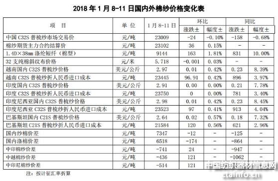 国际原油价格大幅上涨,美元指数下跌,推动国际棉价加速上涨。1月8-11日纽约棉花期货主力合约结算价79.7美分/磅,较上周上涨1.48美分/磅,涨幅1.89%;代表进口棉中国主港到岸均价的国际棉花指数(M)为88.69美分/磅,较上周上涨0.52美分/磅,涨幅0.59%,折人民币进口成本14924元/吨(1%关税,海关计征汇率,下同),较上周上涨85元/吨,涨幅0.57%,低于国内市场737元/吨,内外棉价差较上周缩小96元/吨。