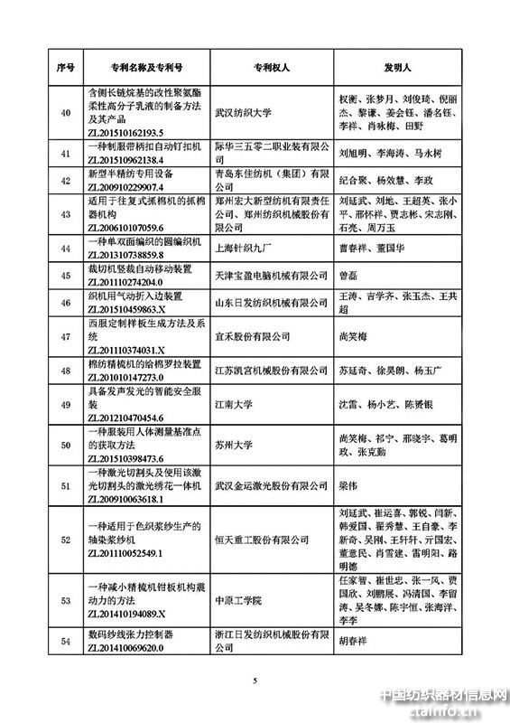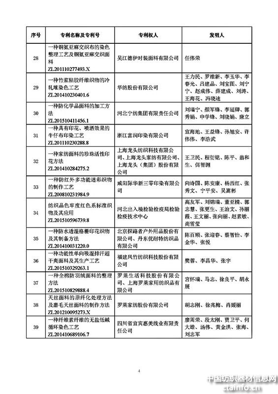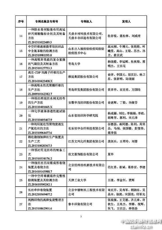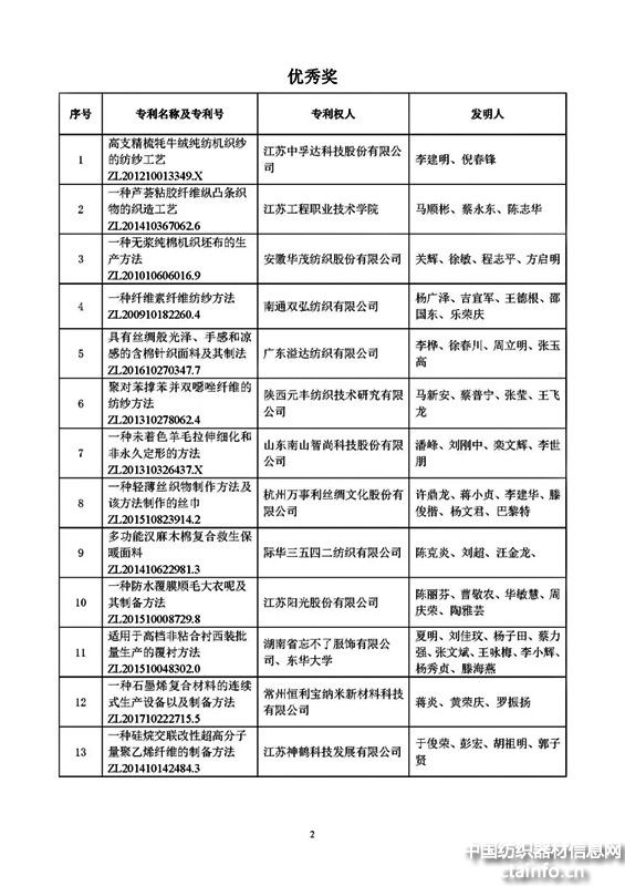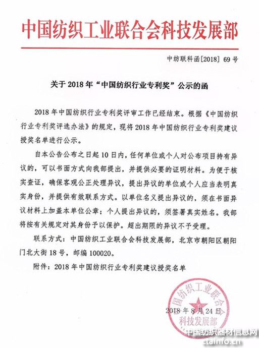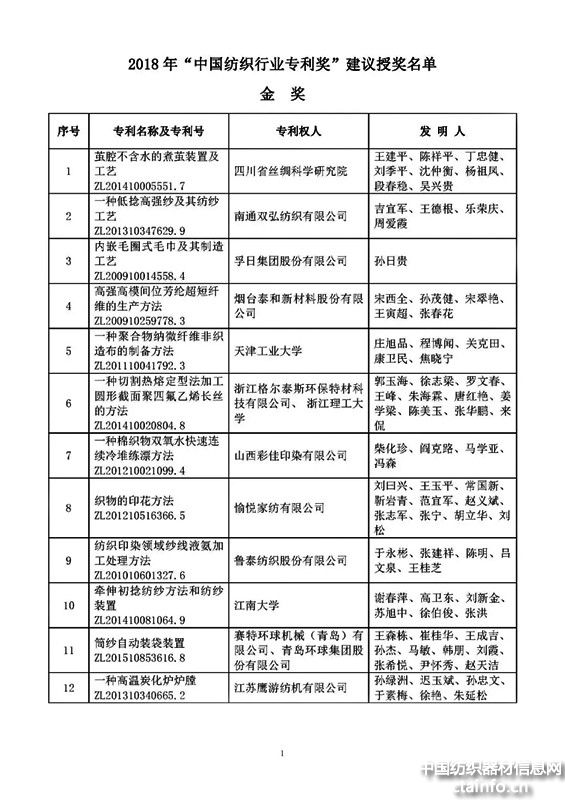 2018年中国纺织行业专利奖评审工作已经结束。根据《中国纺织行业专利奖评选办法》的规定,现将2018年中国纺织行业专利奖建议授奖名单进行公示。