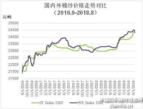 国内棉纱市场价格略有上涨。据调查,国产32支纯棉纱8月均价为23 999元/t,较上月上涨163元/t,涨幅0.68%,较去年同期上涨984元/t,涨幅4.27%;进口32支纯棉纱月均价为24 390元/t,较上月上涨194元/t,涨幅0.80%,较去年同期上涨1102元/t,涨幅 4.73%。月末进口纱现货价格高于国产纱23元/t,价差相对缩小。