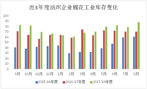 纺织企业原料库存显著增加。截止8月31日,纺织企业在库棉花库存量为88.62万t,较上月底增加9.08万t,同比增加17.63万t。其中:21%的企业减少棉花库存,23%增加库存,56%保持不变。
