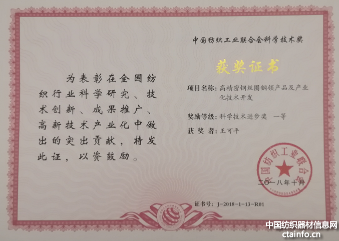 重庆金猫纺织器材有限公司“高精密钢丝圈钢领产品及产业化技术开发”项目获得“纺织之光”2018年度中国纺织工业联合会科学技术奖一等奖。