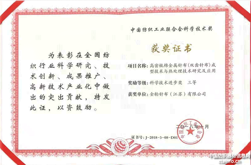 金轮针布(江苏)有限公司、辽东学院“高密梳棉金属针布(双齿针布)成型技术与热处理技术研究及应用”项目获得“纺织之光”2018年度中国纺织工业联合会科学技术奖三等奖。