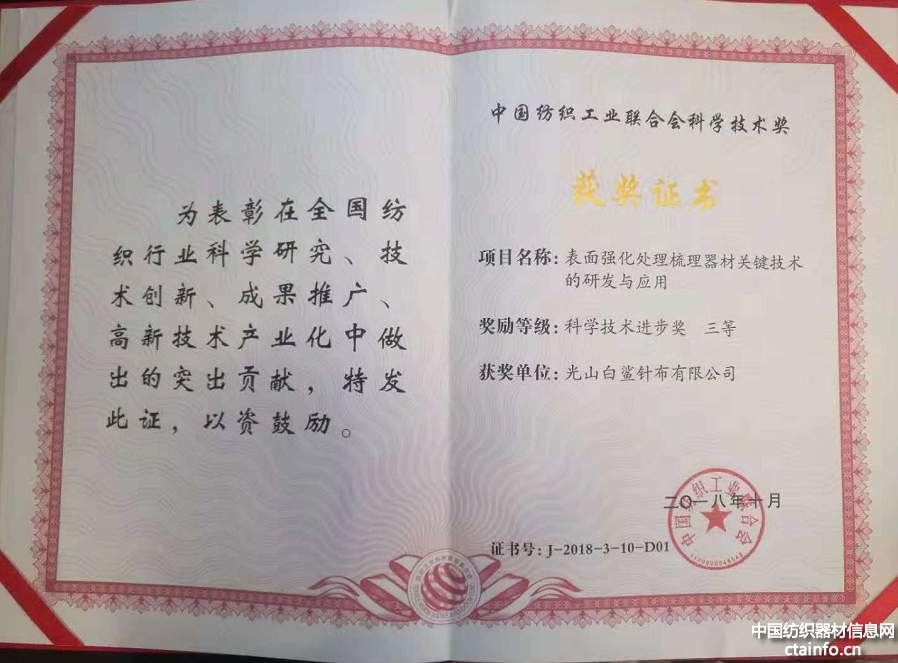 光山白鲨针布有限公司“表面强化处理梳理器材关键技术的研发与应用” 项目获得“纺织之光”2018年度中国纺织工业联合会科学技术奖三等奖。