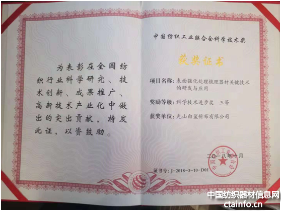 光山白鲨针布有限公司“表面强化处理梳理器材关键技术的研发与应用”项目喜获“纺织之光”2018年度中国纺织工业联合会科学技术奖三等奖。光山白鲨针布有限公司始创于1962年,经过半个多世纪的砥砺前行,白鲨已经发展成为集纤维梳理专件器材研发、制造、销售、技术服务为一体的专业化、国际化公司,产品涵盖了棉纺、产业用纺织品、毛纺、麻纺、特种动物纤维等纺织纤维梳理的各个领域,囊括金属针布、弹性针布、活动盖板针布、固定盖板针布、转杯纺专件、整体锡林等种类,贯穿纤维梳理全流程。