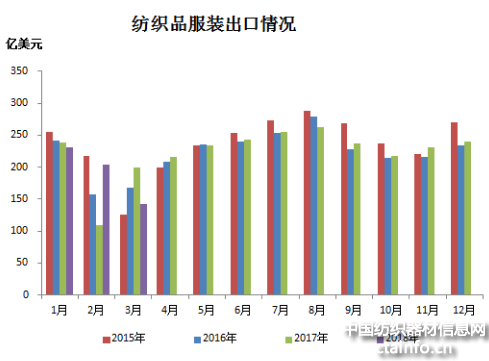 四、纺织品服装出口同比减少
