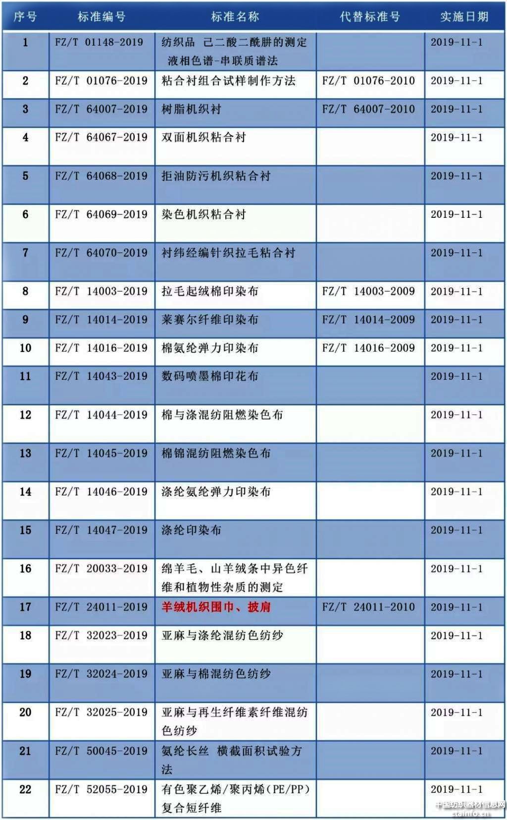 以下纺织标准的实施日期为2019年11月1日。