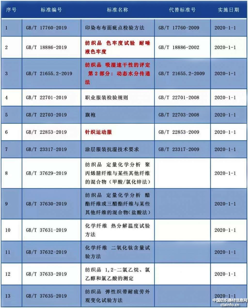 以下纺织标准的实施日期为2020年1月1日。