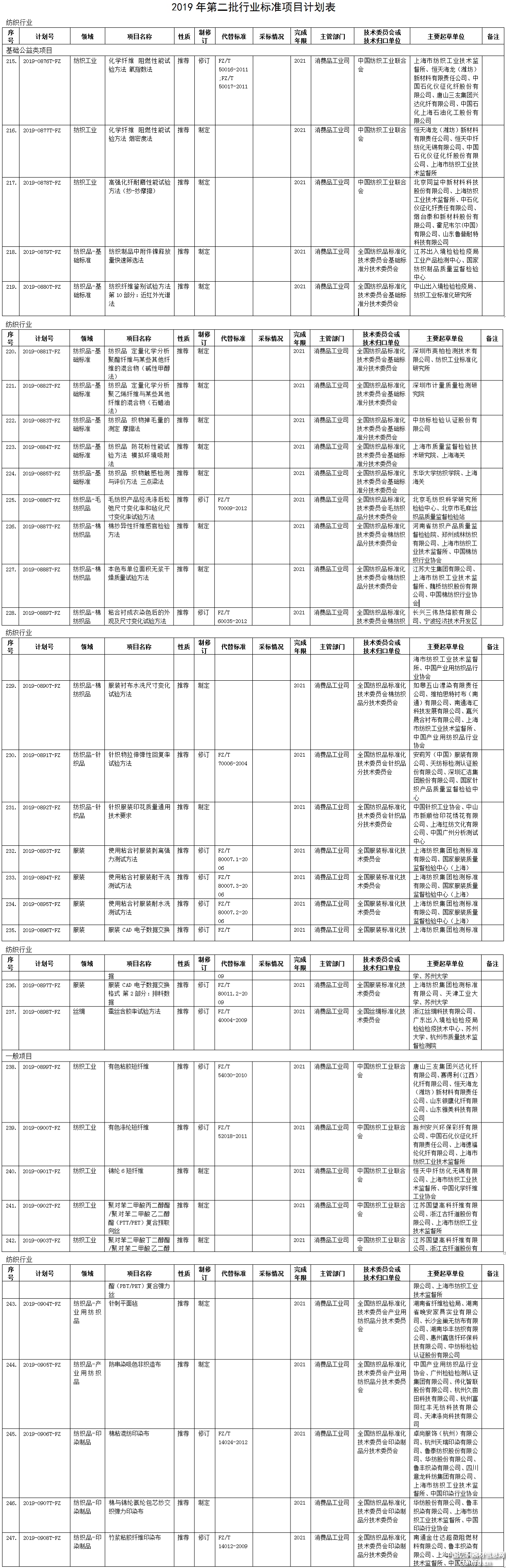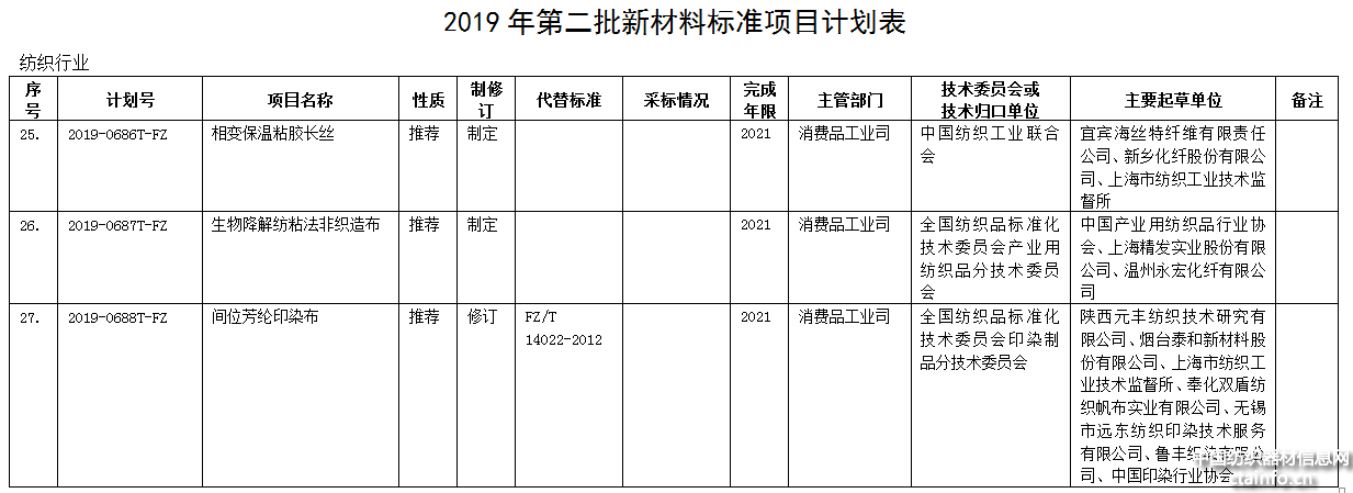 2019年第二批绿色制造标准项目计划表