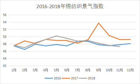 当棉纺织景气指数高于50,表示棉纺行业景气程度向好,低于50则表示景气程度欠佳。从图中可以明显看出,2016-2018年春节过后我国棉纺织行业景气指数呈上升趋势,春节过后,纺企生产经营逐渐步入正规,下游需求增加,订单接踵而至,产品价格小幅上扬,企业利润状况有所改善,行业景气指数出现季节性反弹。