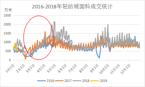 由上图可知,2016-2018年春节过后,下游面料成交情况均为上升趋势。“金三银四”为纺织行业的传统旺季,下游订单增加,需求旺盛,预计2019年节后下游行情依旧会回暖。