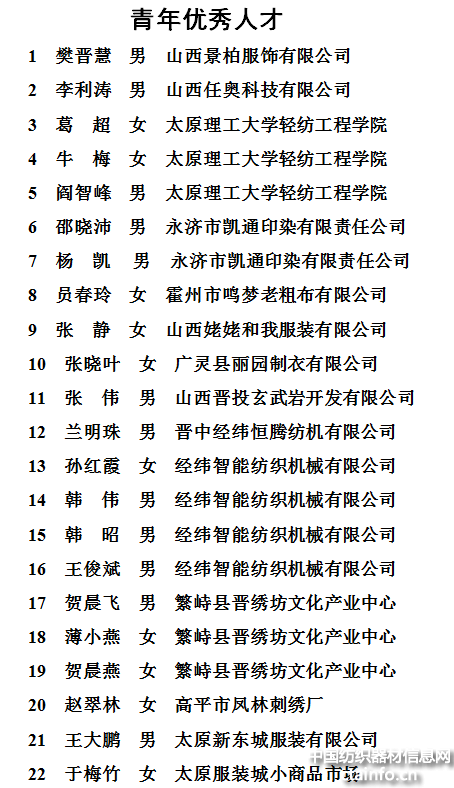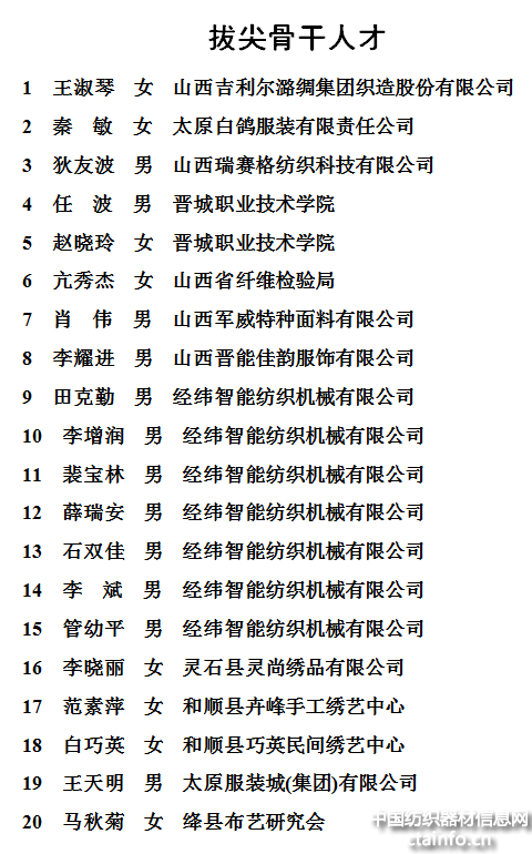 3月22日,山西省召开“三晋英才”支持计划启动大会,礼敬为山西各项事业发展作出突出贡献的英才们。山西纺织服装行业,有42人作为行业优秀人才代表,入选山西省“三晋英才”支持计划。其中:拔尖骨干人才20人(男12人、女8人),青年优秀人才22人(男、女各11人)。