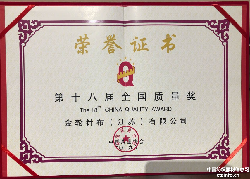 随着几年来卓越绩效模式的深入推进,通过三层次管理成熟度的持续评价与改进,金轮针布取得了卓有成效的发展。为了检验公司推行卓越绩效模式的成果,同时希望通过“以评价促改进,以申奖促提升”,金轮针布于2009年起陆续参加地方、省、国家质量奖的申报,通过持续努力,不断改进提升,公司先后获得了2009年海门市市长质量奖;2015年荣获第四届全国纺织行业质量奖和南通市市长质量奖;2016年度获得“全国实施卓越绩效模式先进企业”荣誉;2017年获评“全国质量奖鼓励奖”;2018年全国纺织行业质量奖复评再次获奖;2019年成功取得第十八届全国质量奖。此外,金轮针布还被江苏省质监局授予“中小企业卓越绩效模式培训基地”。