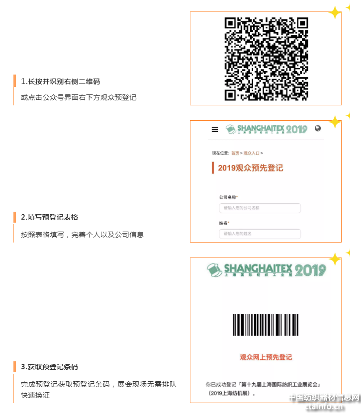 登陆www.shanghaitex.cn 进入2019上海国际纺织工业展览会主页,点击界面内观众预登记,完成预登记获取预登记条码。