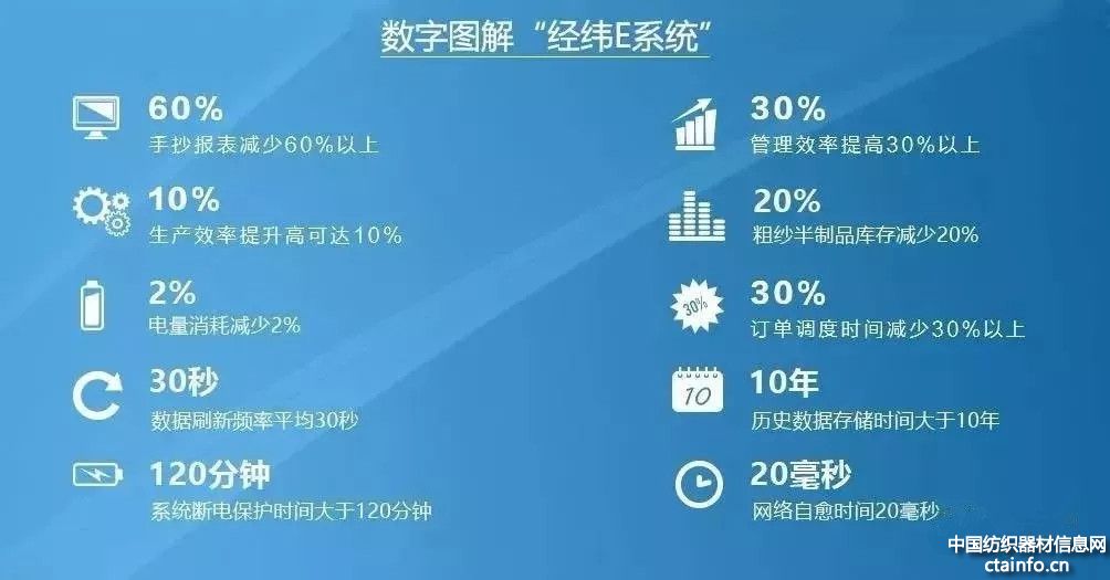“经纬E系统”是经纬纺机(中纺机集团下属企业)依托智能传感技术,在国内首次将不同厂家、不同年代、不同机型、不同接口、不同协议的多种类棉纺织设备并入同一系统,采集清花、成卷、梳棉、预并、精梳、末并、粗砂、细纱、落筒等全工序数据,构建了完善的物联网智能信息采集系统,综合运用兼容多种工业总线协议的智能采集卡、协议转换器、数字滤波技术、总线技术等,将纺织车间的机台运转数据、质量信息、人员信息、设备电量、车间环境温湿度等集成到大数据平台进行深入分析,以数据分析反向指导生产管理,在我国纺织行业率先实现闭环式大数据管理。