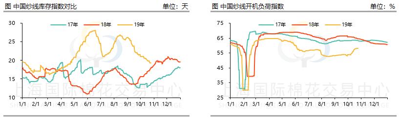 从纱线库存来看,近期走货较为顺畅,但部门品种已经出现走淡,库存下降,但速度有所放缓。目前纺企平均库存在19天左右,已接近去年同期,但与17年相比依然偏高。开机方面,国庆节过后纺企逐步重启,整体缓慢上调,目前开机较为平稳,开机负荷维持在58%左右。