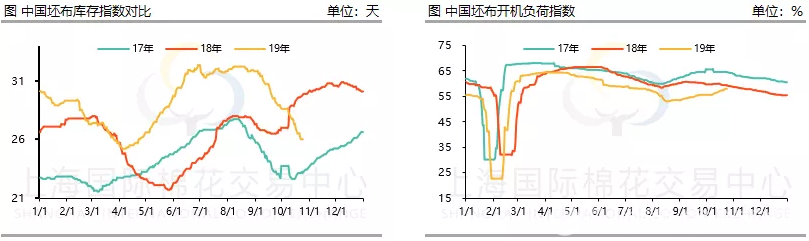 再从下游织厂情况来看,行情走势要比纱线好一些,但由于前期库存太多,目前仍维持在26天上下。目前织厂多在生产冬季订单,但也接近尾声,春夏用布订单不多,局部地区生产库存为来年年后做准备。外销订单疲弱,织厂反映销往越南订单增加。总体来看,下游后市不乐观,采购十分谨慎,观望情绪颇浓。