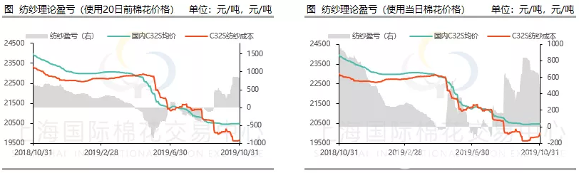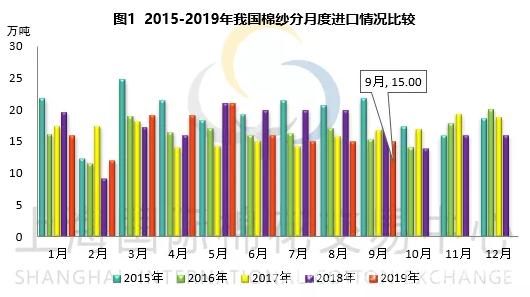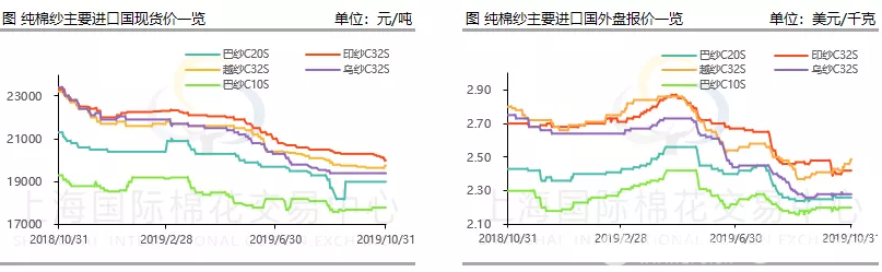 近几个月,内外纱价格相差无几。截至10月31日,FCY Index C32S指数收报21187元/吨,同上周持平。中国海关数据显示,2019年9月中国进口棉纱数量为15万吨,同比去年大幅下滑。但根据市场调研,真实情况却并非那么绝对,主要是海关数据统计口径问题导致大量中国进口巴纱未进入统计系统,估算2019年1-9月,中国进口巴基斯坦棉纱约为24万吨,同比下降10.5%左右。而根据巴基斯坦海关数据显示,2019年1-9月巴基斯坦出口棉纱34.3万吨,同比下降8.9%,其中出口中国比例持稳或者小幅增加。整体来看,中国和巴基斯坦棉纱贸易正常进行,中国进口量持稳为主。