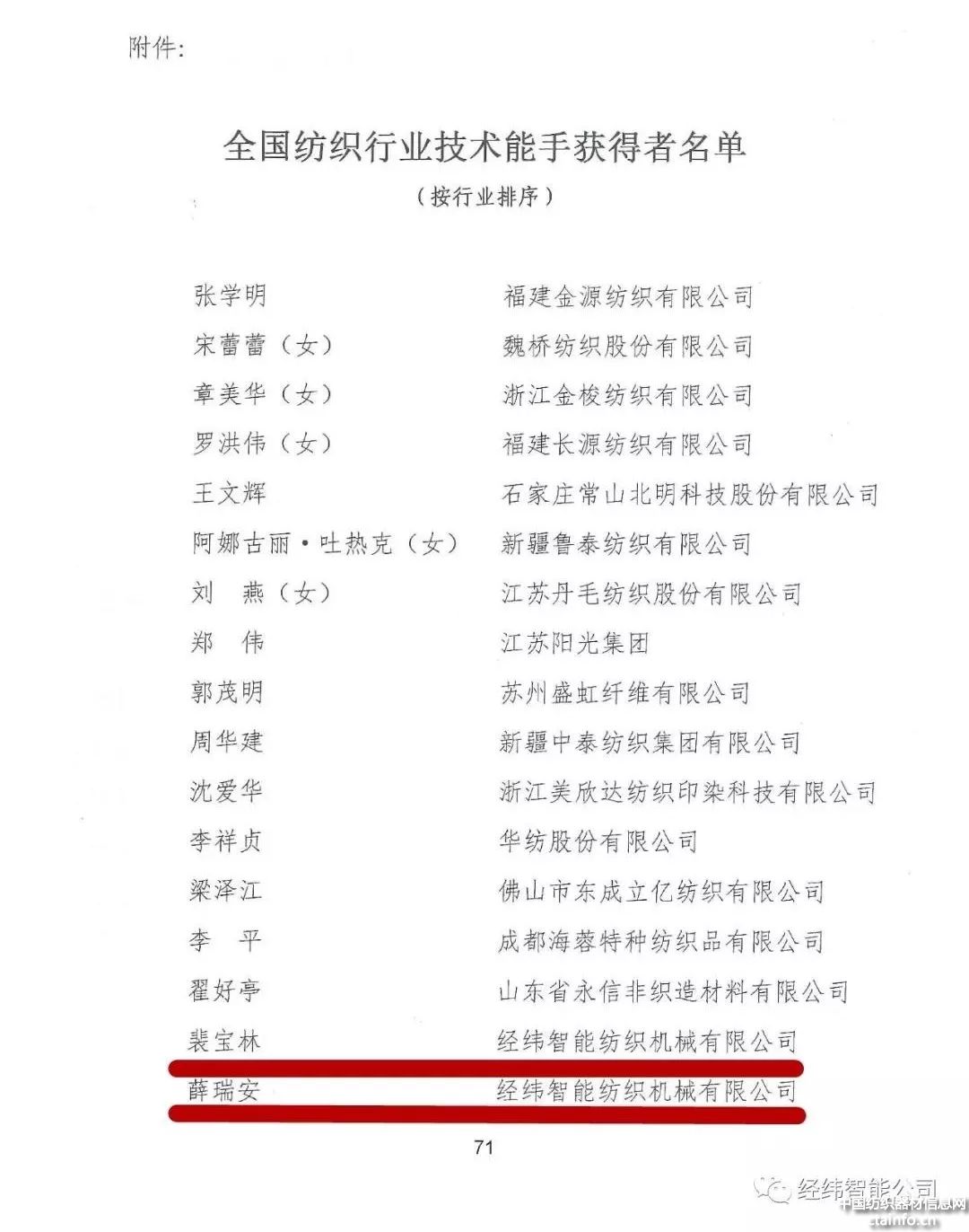 经纬智能公司职工裴宝林、薛瑞安两位同志获得“全国纺织行业技术能手”荣誉称号。