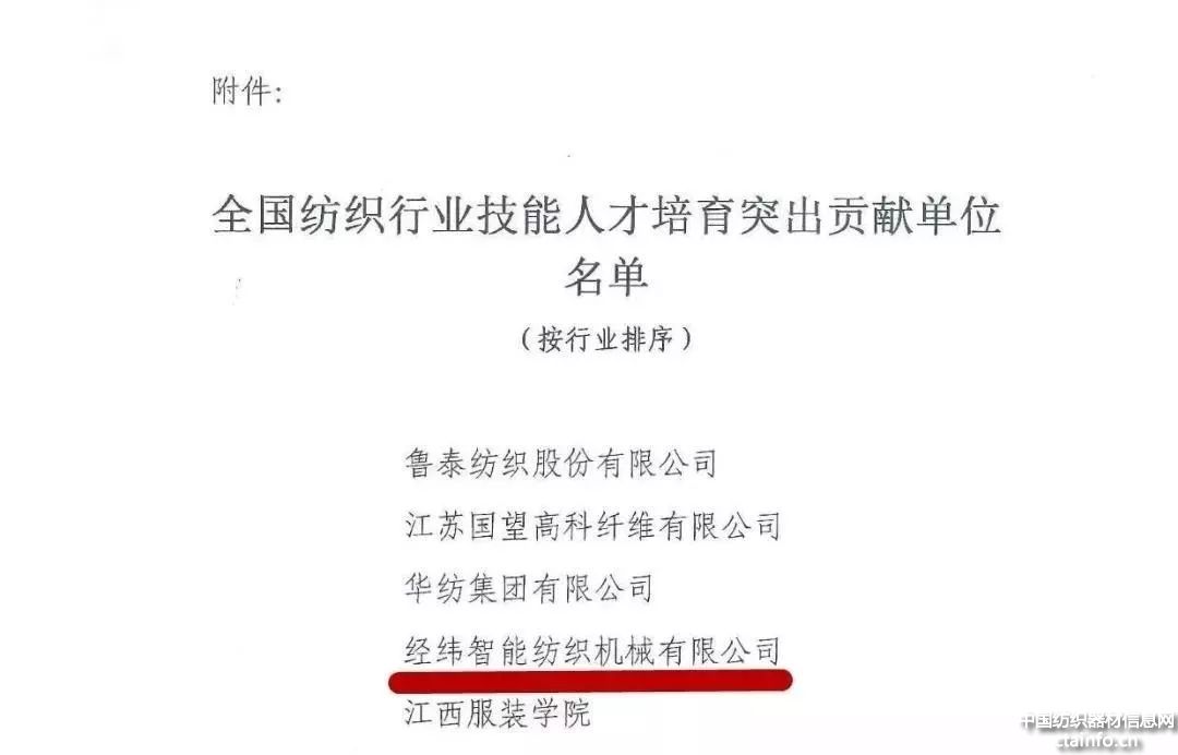 经纬智能公司获得“全国纺织行业技能人才培育突出贡献单位”称号。