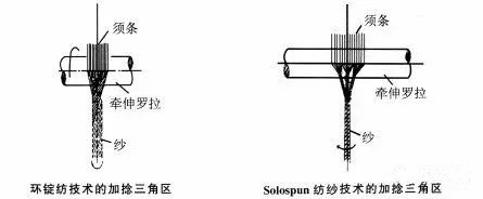 这一加捻机理使SolospunTM纱具有类似于多股纱的特殊结构。SolospunTM纱的耐磨性可以与双股纱相媲美,但极大地降低了加工成本,且同双股纱技术相比,SolospunTM纱可以用同样的原料纺制出更细的纱线。由于须条束的预加捻作用,最终加捻成纱后,纱体形成了类似缆线的结构,因此可以提高成纱强力和耐磨性,改善条干,降低纱线毛羽。