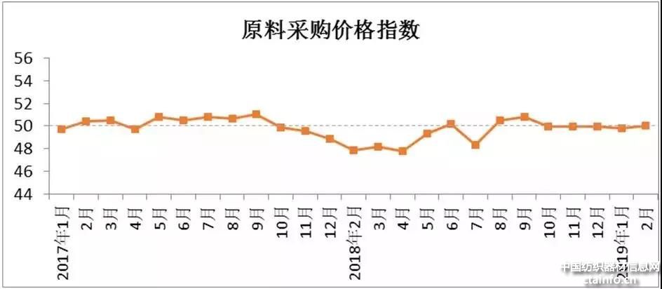 2月原料采购价格指数50,与1月相比上升0.18。2月,春节假期,上旬棉花市场交易基本停滞,下旬由于中美贸易谈判取得进展、纺织企业陆续开工对棉花需求量逐渐回升等,对棉花价格起到支撑作用,棉价小幅上涨。2月,CotlookA指数平均值81.15美分/磅,环比下降1.2美分/磅;国内3128B级棉花现货均价为15159元/t,环比增加105元/t。节后涤纶短纤报价稳中偏强,粘胶短纤市场维持以往惯例,上调报价。2月,主流粘胶纤维均价为13445元/t,环比增加150元/t;1.4D直纺涤短均价为8866元/t,环比增加67元/t。3月,棉花价格延续小幅上涨态势,化纤短纤价格走弱,预计3月原料采购价格指数与2月基本保持平稳。