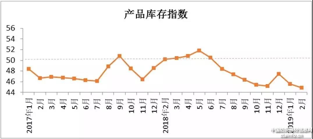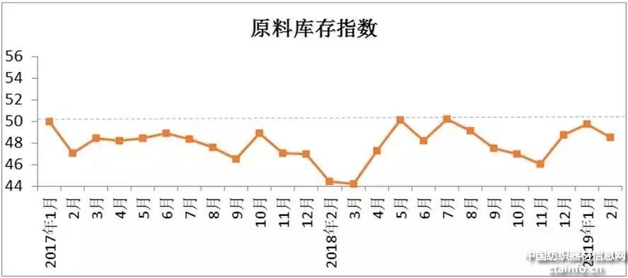 2月原料库存指数48.49,与1月相比下降1.24。跟踪企业数据显示,2月,企业原料库存环比下降0.89%。其中,原棉库存环比下降1.94%,进口棉库存环比下降1.03%,非棉纤维库存环比增加2.12%。主要原因:一是节后市场交投尚未完全恢复,企业原料采购下降;二是虽然原料价格有回暖趋势,但企业普遍对2019年棉花调控政策持观望态度,担心潜在贬值风险,购买意愿不强。3月,新一波春季订单来临,企业开工正常,原料消耗较2月增加,预计增加原料库存意愿增强,3月原料库存指数上升。